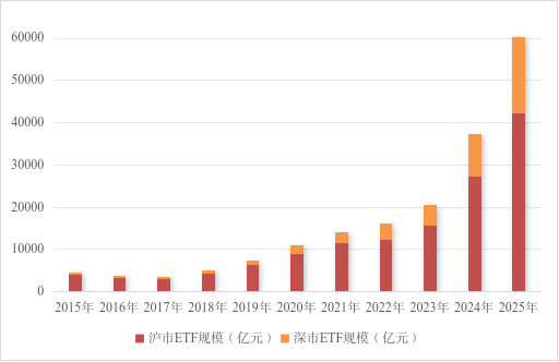 2025年,随着《关于推动中长期资金入市工作的实施方案》《促进资本市场指数化投资高质量发展行动方案》《推动公募基金高质量发展行动方案》等一揽子政策相继落地实施,伴随市场有效性提升,ETF市场结构不断优化,投资生态持续完善,在引导增量资金入市、服务实体经济以及居民财富管理需求、拓宽中长期资金入市渠道、提升投资者获得感、稳步扩大资本市场高水平制度型开放等方面发挥了积极作用。境内ETF市场规模先后突破4万亿元、5万亿元、6万亿元,超过日本成为亚洲第一大ETF市场。