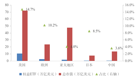 截至2025年底,美国股票ETF规模为10.6万亿美元,美国股票市场总市值为72.1万亿美元,占比为14.7%;欧洲股票ETF规模为2.4万亿美元,欧洲股票市场总市值为23.5万亿美元,占比为10.2%。从亚太地区内部来看,日本股票ETF规模为0.7万亿美元,日本股票市场总市值为7.8万亿美元,占比约8.5%;中国股票ETF规模为0.6万亿美元,占比约3.6%,还有较大发展空间。