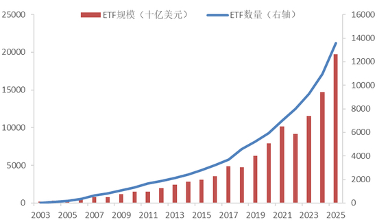截至2025年底,全球挂牌交易的ETF达13865只,资产总规模达到19.7万亿美元,较2024年底增长31%。近20年的规模年均复合增长率超20%,产品数量更是连续20年保持正增长。