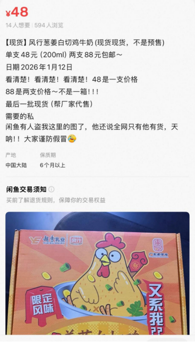 供需缺口催生了二手交易市场的溢价空间。《BUG》栏目观察到,在闲鱼上,已有卖家挂出高价转售链接,原价5元一盒的牛奶涨价近10倍至48元,也有卖家涨价100元出售整箱牛奶,商品描述中注明“2月初发货”,卖家称“涨价是因为2月厂家其实也补不了多少货”。