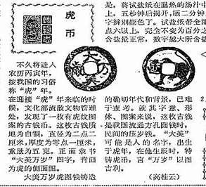 1986年农历丙寅年到来之际,文化部流散文物管理处发现了一枚有虎纹图案的古钱币。这枚古钱质地为白铜,直径为二点二厘米,厚度为零点一厘米,重量为五克。正面隶书“大美万岁”四字,背面为虎的侧面图。就其字意、形体、图案来说,这枚古钱是我国流通方孔圆钱时,民间的压岁钱。“大美”可能是人的名字,出生于虎年,在他生辰时,特铸虎币,言“万岁”以图吉利。(1986年1月23日《北京晚报》3版《虎币》,见上图。)