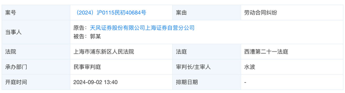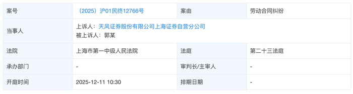 天眼查信息显示,2025年12月11日,上海市第一中级人民法院开庭审理了一起备受市场关注的劳动合同纠纷案。上诉人为天风证券股份有限公司上海证券自营分公司(以下简称“天风自营分公司”),被上诉人为原天风证券副总裁郭胜北。