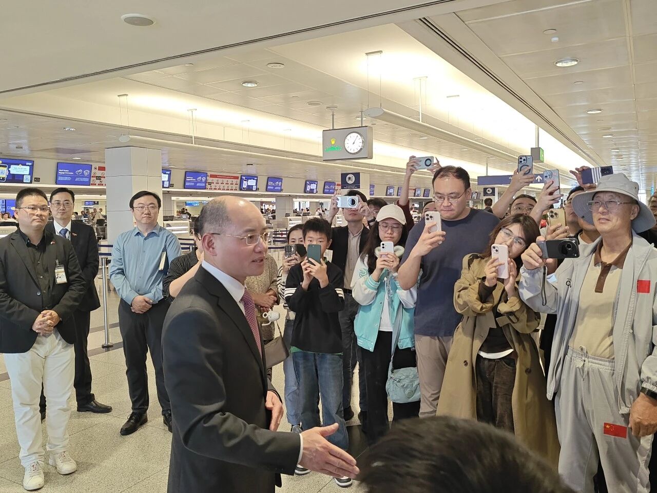 据微信公众号“中国驻阿联酋大使馆”消息,2026年3月7日,新任中国驻阿联酋大使曾继新抵达阿联酋后,立即前往迪拜国际机场为搭乘首班增开航班回国的同胞送行,驻迪拜总领事欧渤芊陪同参加。