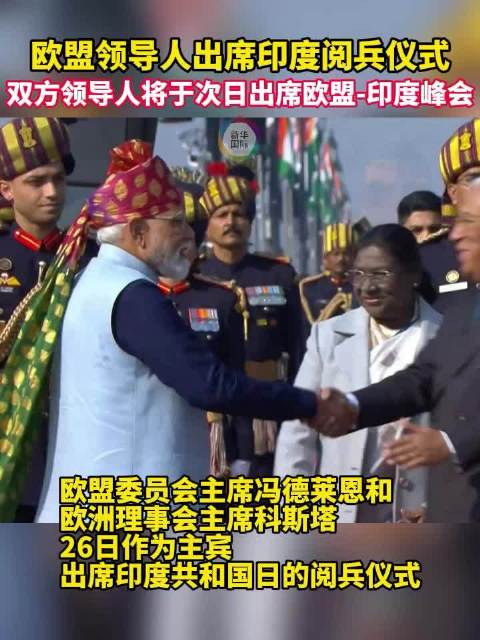欧盟委员会主席冯德莱恩和欧洲理事会主席科斯塔于26日在印度首都新德里出席了印度共和国日阅兵式。