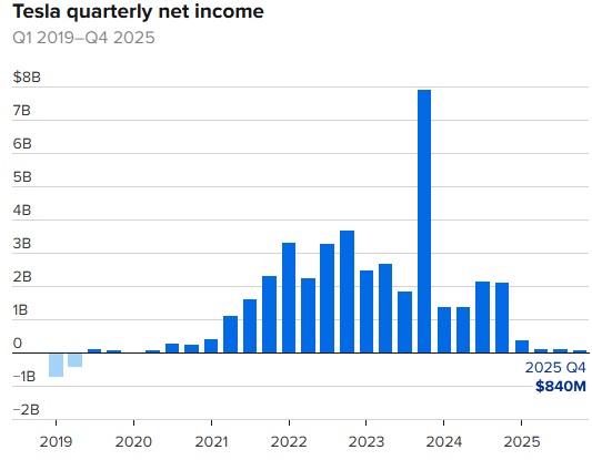 受运营成本同比激增 39% 影响,特斯拉四季度净利润同比暴跌 61%,从去年同期的 21 亿美元(每股收益 0.60 美元)降至 8.4 亿美元(每股收益 0.24 美元)。