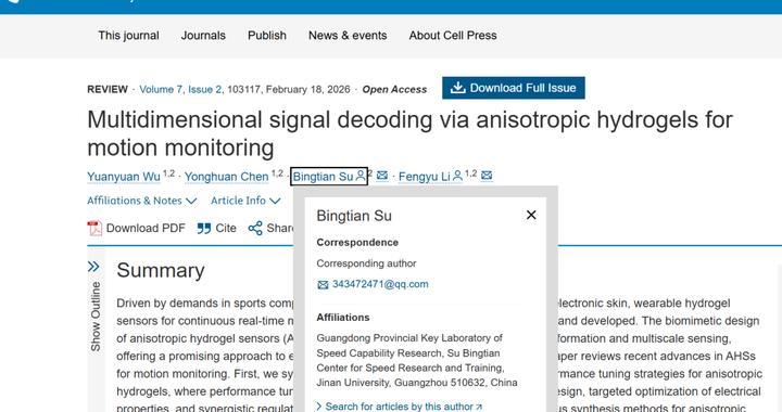 2月18日,暨南大学化学与材料科学学院李风煜教授、暨南大学体育学院苏炳添教授作为共同通讯作者(吴媛媛为论文第一作者),在Cell子刊《Cell Reports Physical Science》上发表了题为《Multidimensional Signal Decoding via Anisotropic Hydrogels for Motion Monitoring》的综述论文。