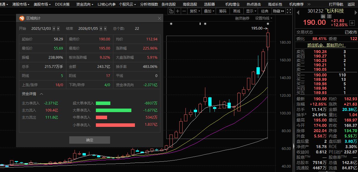 根据东方财富数据显示,2025年12月3日至2026年1月5日收盘期间,飞沃科技在22个交易日内累计上涨225.96%。期间总成交额达243.7亿元,累计换手率达483.06%。相比之下,同期所属板块涨幅仅9.32%,大盘涨幅为5.91%。