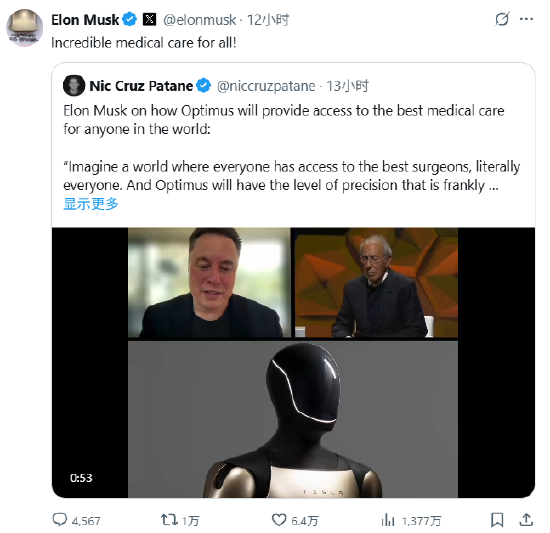 针对该帖子,马斯克回应道:“为所有人提供不可思议的医疗服务!”