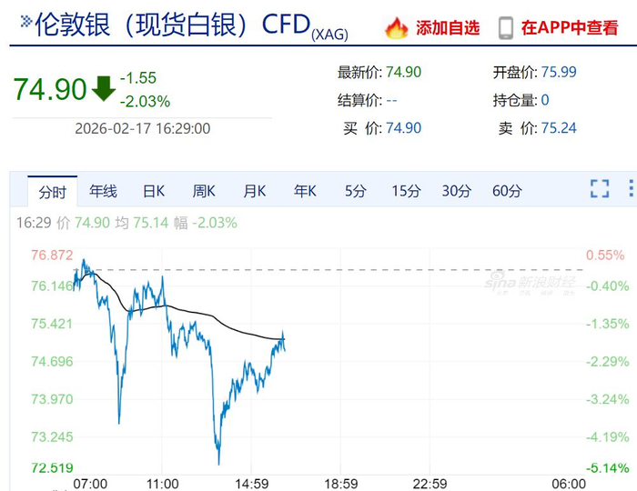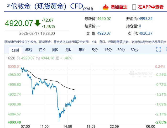 2月17日,现货黄金、白银价格盘中突然大幅跳水,白银一度暴跌约5%,随后跌幅收窄;现货黄金跌破4900美元/盎司,截至发稿报4920.07美元/盎司。