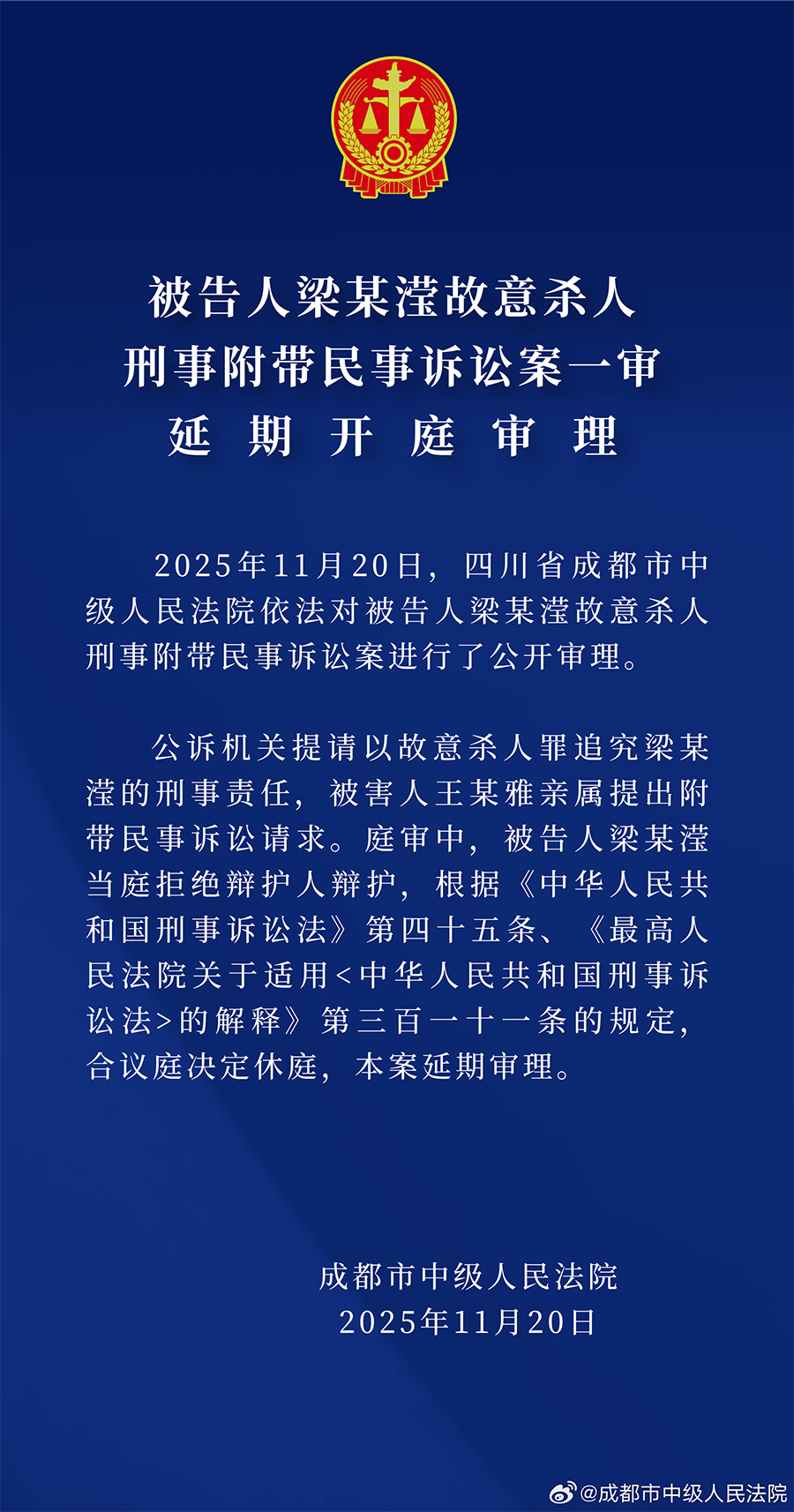 2025年11月20日,四川省成都市中级人民法院依法对被告人梁某滢故意杀人刑事附带民事诉讼案进行了公开审理。